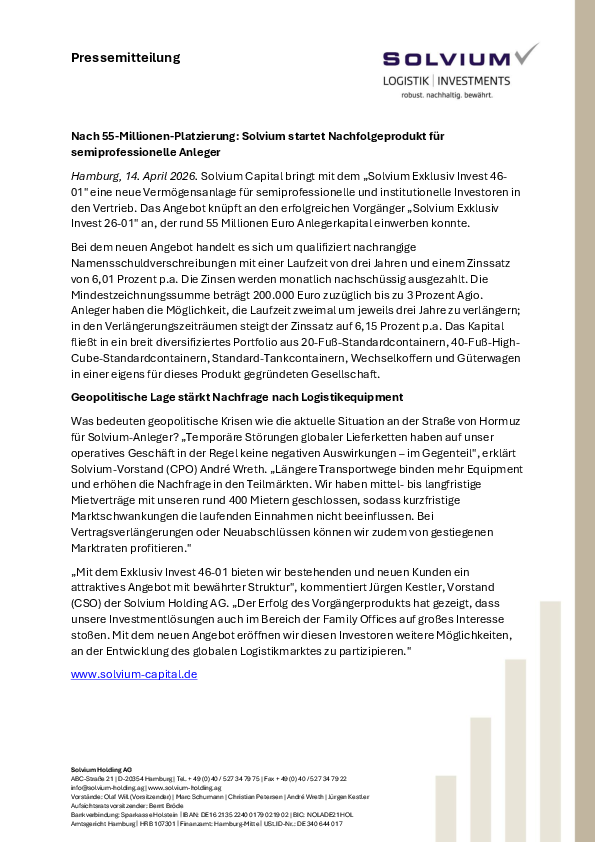 Hamburg, 14. April 2026. Solvium Capital bringt mit dem „Solvium Exklusiv Invest 46-01" eine neue Vermögensanlage für semiprofessionelle und institutionelle Investoren in den Vertrieb. Das Angebot knüpft an den erfolgreichen Vorgänger „Solvium Exklusiv Invest 26-01" an, der rund 55 Millionen Euro Anlegerkapital einwerben konnte.