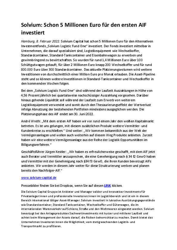 Hamburg, 8. Februar 2022. Solvium Capital hat schon 5 Millionen Euro für den Alternativen Investmentfonds „Solvium Logistic Fund One“ investiert. Der Fonds investiert mittelbar in Unternehmen, die darauf spezialisiert sind, Logistikequipment wie Wechselkoffer, Standardcontainer, Standard-Tankcontainer und Eisenbahnwagen zu erwerben und gewinnbringend zu bewirtschaften. So wurden für rund 1,4 Millionen Euro über 100 Schüttgutwagen gekauft, für über 2 Millionen Euro knapp 200 Wechselkoffer und für rund 800.000 Euro über 300 Standardcontainer. Das aktuelle Platzierungsvolumen wird weitere Investitionen von durchschnittlich einer Million Euro pro Monat erlauben. Die Asset-Pipeline steht und so können weitere Investitionen in Standard-Tankcontainer und Wechselkoffer in den kommenden Wochen folgen.