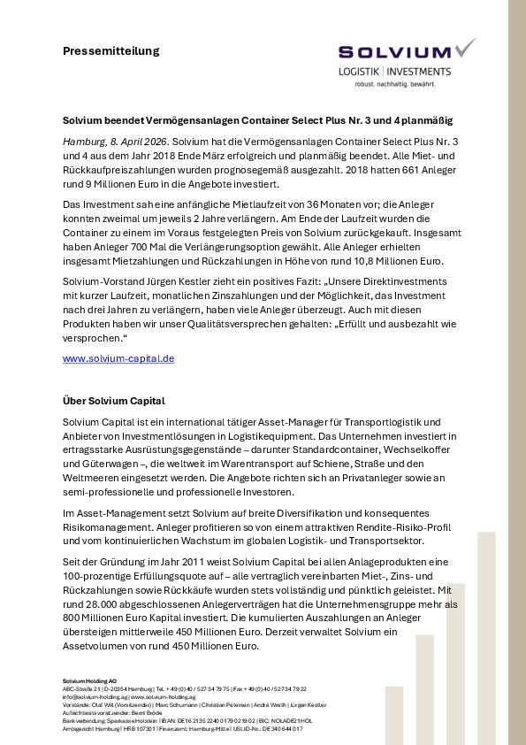 Hamburg, 8. April 2026 Solvium hat die Vermögensanlagen Container Select Plus Nr. 3 und 4 aus dem Jahr 2018 Ende März erfolgreich und planmäßig beendet. Alle Miet- und Rückkaufpreiszahlungen wurden prognosegemäß ausgezahlt. 2018 hatten 661 Anleger rund 9 Millionen Euro in die Angebote investiert.