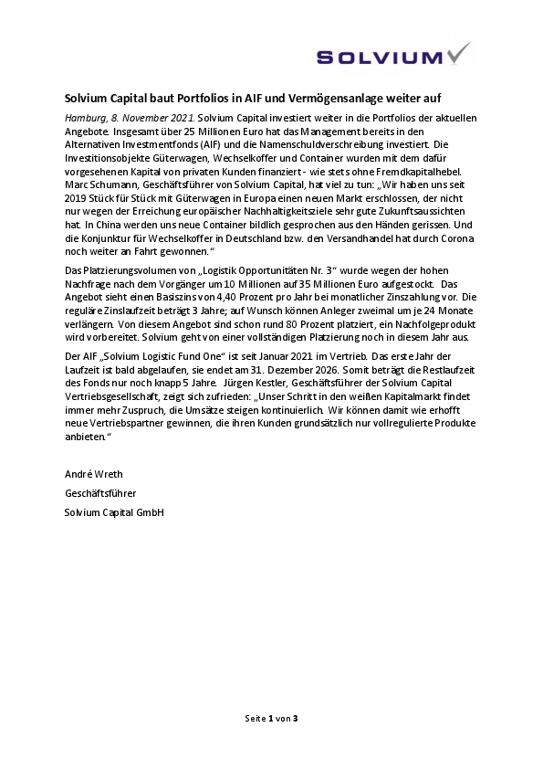Das Platzierungsvolumen von „Logistik Opportunitäten Nr. 3“ wurde wegen der hohen Nachfrage nach dem Vorgänger um 10 Millionen auf 35 Millionen Euro aufgestockt. Das Angebot sieht einen Basiszins von 4,40 Prozent pro Jahr bei monatlicher Zinszahlung vor. Die reguläre Zinslaufzeit beträgt 3 Jahre; auf Wunsch können Anleger zweimal um je 24 Monate verlängern. Von diesem Angebot sind schon rund 80 Prozent platziert, ein Nachfolgeprodukt wird vorbereitet. Solvium geht von einer vollständigen Platzierung noch in diesem Jahr aus.