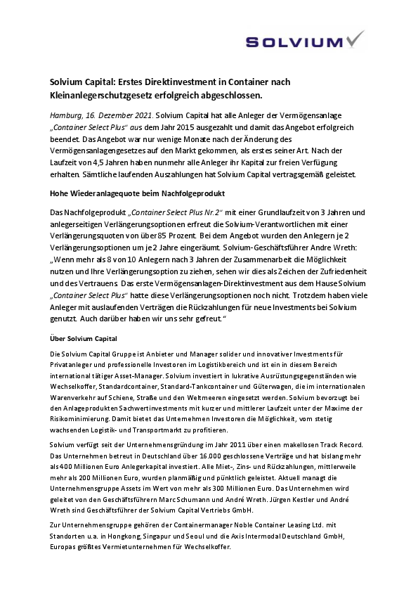Solvium Capital hat alle Anleger der Vermögensanlage „Container Select Plus“ aus dem Jahr 2015 ausgezahlt und damit das Angebot erfolgreich beendet. Das Angebot war nur wenige Monate nach der Änderung des Vermögensanlagengesetzes auf den Markt gekommen, als erstes seiner Art.