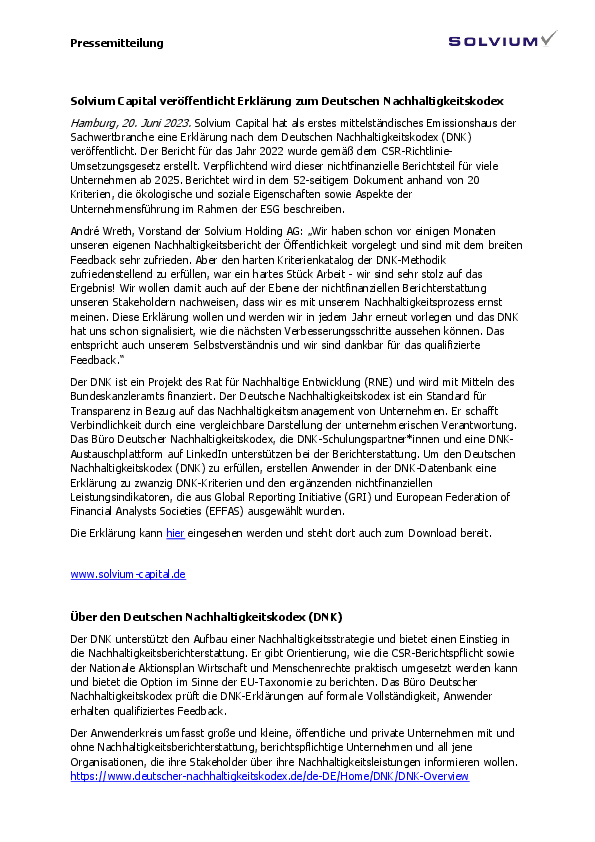 Hamburg, 20. Juni 2023. Solvium Capital hat als erstes mittelständisches Emissionshaus der Sachwertbranche eine Erklärung nach dem Deutschen Nachhaltigkeitskodex (DNK) veröffentlicht. Der Bericht für das Jahr 2022 wurde gemäß dem CSR-Richtlinie-Umsetzungsgesetz erstellt. Verpflichtend wird dieser nichtfinanzielle Berichtsteil für viele Unternehmen ab 2025. Berichtet wird in dem 52-seitigem Dokument anhand von 20 Kriterien, die ökologische und soziale Eigenschaften sowie Aspekte der Unternehmensführung im Rahmen der ESG beschreiben.