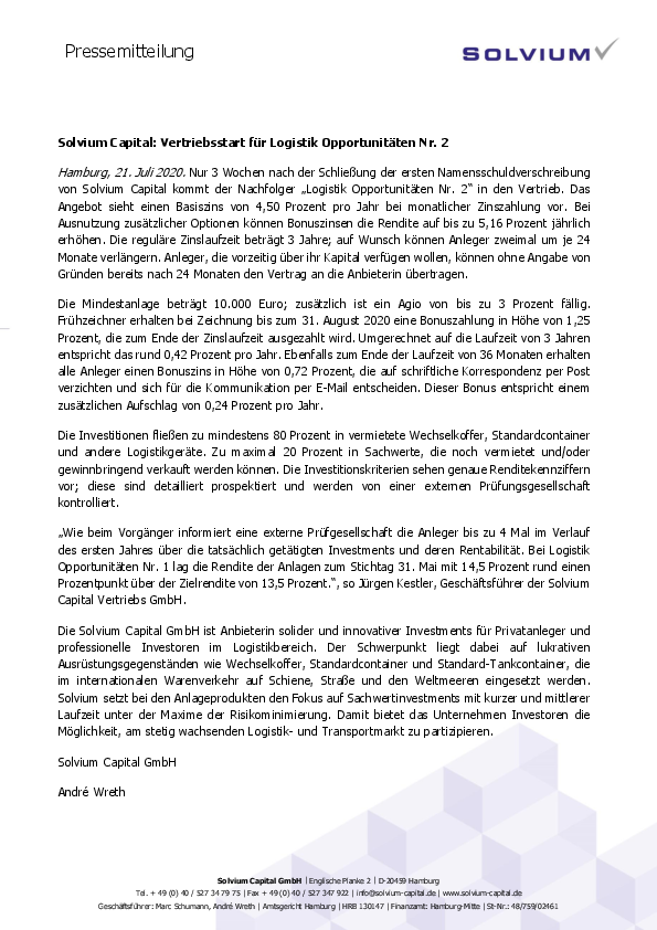 Hamburg, 21. Juli 2020. Nur 3 Wochen nach der Schließung der ersten Namensschuldverschreibung von Solvium Capital kommt der Nachfolger „Logistik Opportunitäten Nr. 2“ in den Vertrieb. Das Angebot sieht einen Basiszins von 4,50 Prozent pro Jahr bei monatlicher Zinszahlung vor. Bei Ausnutzung zusätzlicher Optionen können Bonuszinsen die Rendite auf bis zu 5,16 Prozent jährlich erhöhen. Die reguläre Zinslaufzeit beträgt 3 Jahre; auf Wunsch können Anleger zweimal um je 24 Monate verlängern. Anleger, die vorzeitig über ihr Kapital verfügen wollen, können ohne Angabe von Gründen bereits nach 24 Monaten den Vertrag an die Anbieterin übertragen.