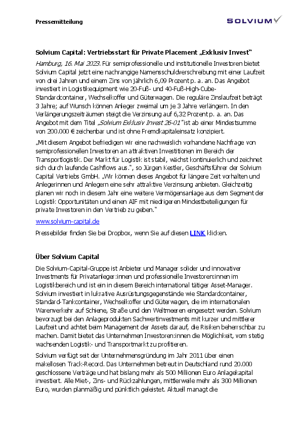 „Mit diesem Angebot befriedigen wir eine nachweislich vorhandene Nachfrage von semiprofessionellen Investoren an attraktiven Investitionen im Bereich der Transportlogistik. Der Markt für Logistik ist stabil, wächst kontinuierlich und zeichnet sich durch laufende Cashflows aus.“, so Jürgen Kestler, Geschäftsführer der Solvium Capital Vertriebs GmbH. „Wir können dieses Angebot für längere Zeit vorhalten und Anlegerinnen und Anlegern eine sehr attraktive Verzinsung anbieten. Gleichzeitig planen wir noch in diesem Jahr eine weitere Vermögensanlage aus dem Segment der Logistik Opportunitäten und einen AIF mit niedrigeren Mindestbeteiligungen für private Investoren in den Vertrieb zu geben.“
