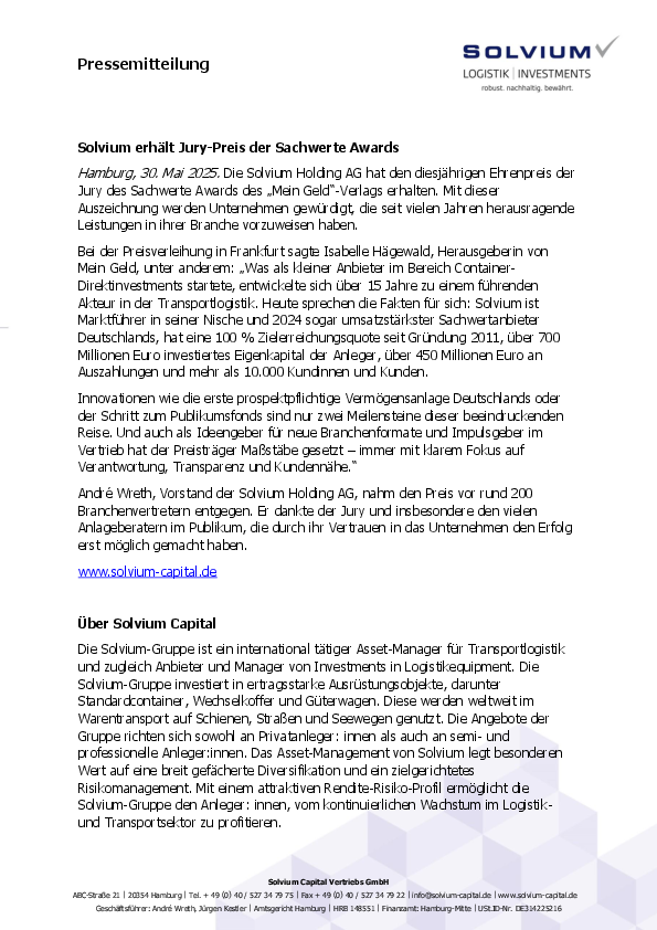 Bei der Preisverleihung in Frankfurt sagte Isabelle Hägewald, Herausgeberin von Mein Geld, unter anderem: „Was als kleiner Anbieter im Bereich Container-Direktinvestments startete, entwickelte sich über 15 Jahre zu einem führenden Akteur in der Transportlogistik. Heute sprechen die Fakten für sich: Solvium ist Marktführer in seiner Nische und 2024 sogar umsatzstärkster Sachwertanbieter Deutschlands, hat eine 100 % Zielerreichungsquote seit Gründung 2011, über 700 Millionen Euro investiertes Eigenkapital der Anleger, über 450 Millionen Euro an Auszahlungen und mehr als 10.000 Kundinnen und Kunden.