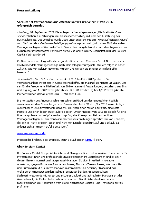 Co-Geschäftsführer Jürgen Kestler ergänzt: „Dies ist nach Container Select Nr. 1 bereits die zweite beendete Vermögensanlage nach Kleinanlegerschutzgesetz. Weitere folgen in naher Zukunft. Wie von Solvium gewohnt, wurden und werden die Investments planmäßig beendet.“