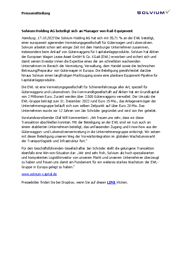 Hamburg, 17.10.2023 Die Solvium Holding AG hat sich mit 35,71 % an der EWL beteiligt, einer europaweit agierenden Vermietungsgesellschaft für Güterwagen und Lokomotiven.