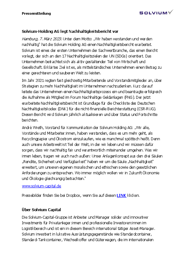 Im Jahr 2021 regten fast gleichzeitig Mitarbeitende und Vorstandsmitglieder an, über Strategien zu mehr Nachhaltigkeit im Unternehmen nachzudenken. Kurz darauf leitete das Unternehmen einen Nachhaltigkeitsprozess ein und beantragte erfolgreich die Aufnahme als Mitglied im Forum Nachhaltige Geldanlagen (FNG). Der jetzt erarbeitete Nachhaltigkeitsbericht ist Grundlage für die Checkliste des Deutschen Nachhaltigkeitskodex (DNK) für die nicht-finanzielle Berichterstattung (CSR-RUG). Diesen Bericht wird Solvium jährlich aktualisieren und über Status und Fortschritte berichten.
