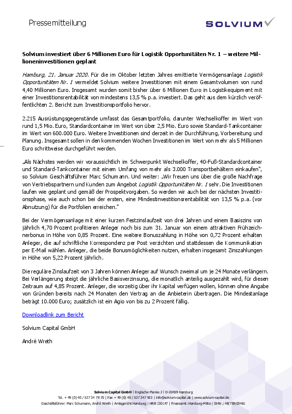 Hamburg, 21. Januar 2020. Für die im Oktober letzten Jahres emittierte Vermögensanlage Logistik Opportunitäten Nr. 1 vermeldet Solvium weitere Investitionen mit einem Gesamtvolumen von rund 4,40 Millionen Euro. Insgesamt wurden somit bisher über 6 Millionen Euro in Logistikequipment mit einer Investitionsrentabilität von mindestens 13,5 % p.a. investiert. Das geht aus dem kürzlich veröffentlichten 2. Bericht zum Investitionsportfolio hervor.