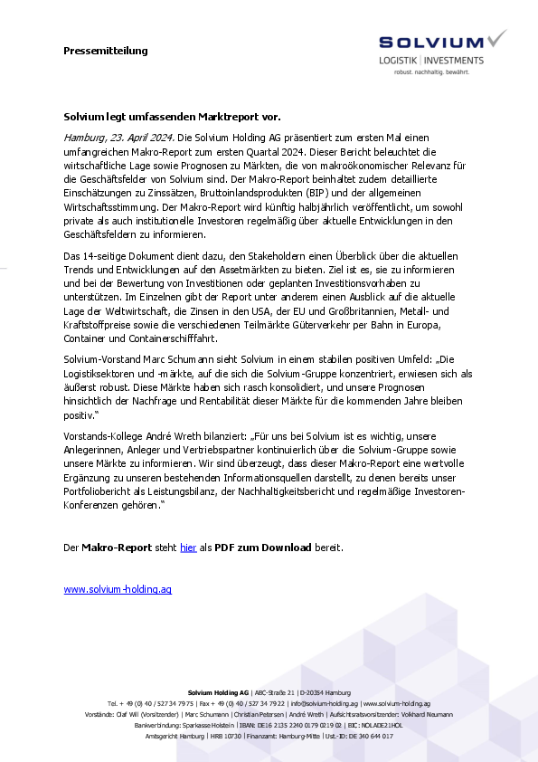 Hamburg, 23. April 2024. Die Solvium Holding AG präsentiert zum ersten Mal einen umfangreichen Makro-Report zum ersten Quartal 2024. Dieser Bericht beleuchtet die wirtschaftliche Lage sowie Prognosen zu Märkten, die von makroökonomischer Relevanz für die Geschäftsfelder von Solvium sind. Der Makro-Report beinhaltet zudem detaillierte Einschätzungen zu Zinssätzen, Bruttoinlandsprodukten (BIP) und der allgemeinen Wirtschaftsstimmung. Der Makro-Report wird künftig halbjährlich veröffentlicht, um sowohl private als auch institutionelle Investoren regelmäßig über aktuelle Entwicklungen in den Geschäftsfeldern zu informieren.