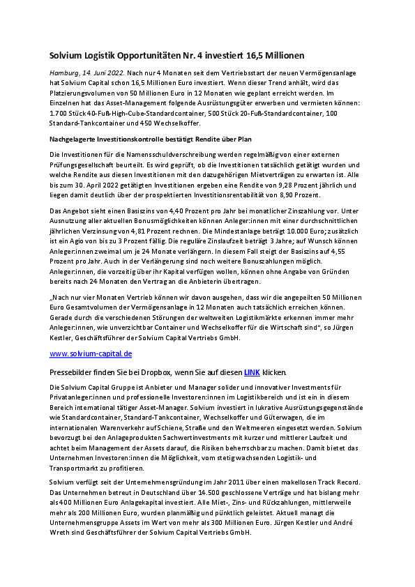 „Nach nur vier Monaten Vertrieb können wir davon ausgehen, dass wir die angepeilten 50 Millionen Euro Gesamtvolumen der Vermögensanlage in 12 Monaten auch tatsächlich erreichen können. Gerade durch die verschiedenen Störungen der weltweiten Logistikmärkte erkennen immer mehr Anleger:innen, wie unverzichtbar Container und Wechselkoffer für die Wirtschaft sind“, so Jürgen Kestler, Geschäftsführer der Solvium Capital Vertriebs GmbH.