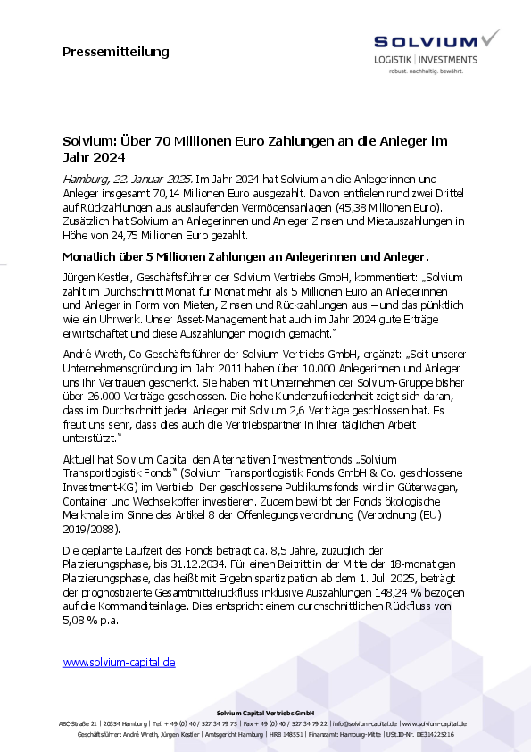 Jürgen Kestler, Geschäftsführer der Solvium Vertriebs GmbH, kommentiert: „Solvium zahlt im Durchschnitt Monat für Monat mehr als 5 Millionen Euro an Anlegerinnen und Anleger in Form von Mieten, Zinsen und Rückzahlungen aus – und das pünktlich wie ein Uhrwerk. Unser Asset-Management hat auch im Jahr 2024 gute Erträge erwirtschaftet und diese Auszahlungen möglich gemacht.“