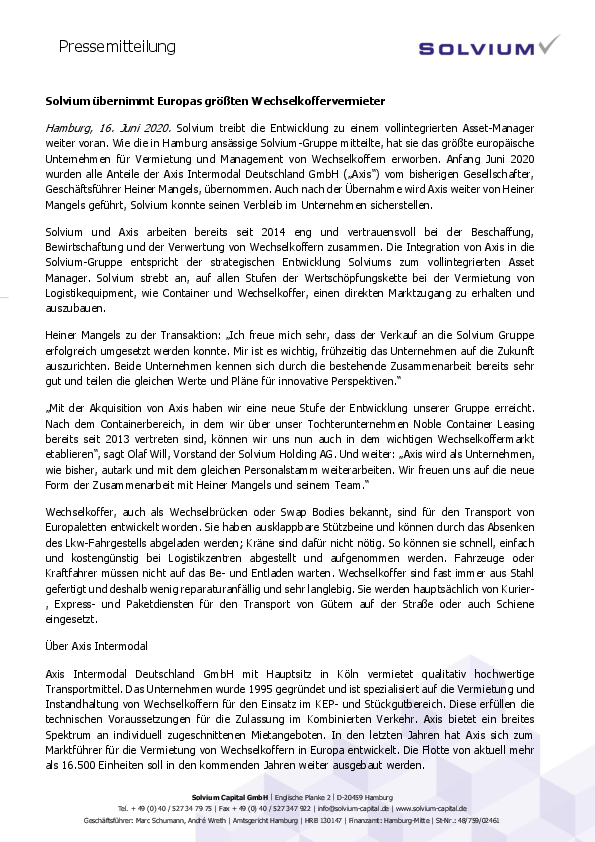Hamburg, 16. Juni 2020. Solvium treibt die Entwicklung zu einem vollintegrierten Asset-Manager weiter voran. Wie die in Hamburg ansässige Solvium-Gruppe mitteilte, hat sie das größte europäische Unternehmen für Vermietung und Management von Wechselkoffern erworben. Anfang Juni 2020 wurden alle Anteile der Axis Intermodal Deutschland GmbH („Axis“) vom bisherigen Gesellschafter, Geschäftsführer Heiner Mangels, übernommen. Auch nach der Übernahme wird Axis weiter von Heiner Mangels geführt, Solvium konnte seinen Verbleib im Unternehmen sicherstellen.