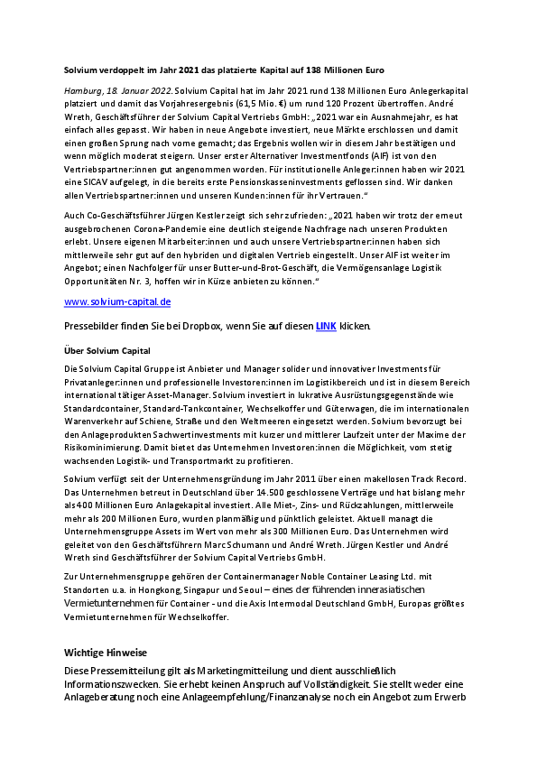 Hamburg, 18. Januar 2022. Solvium Capital hat im Jahr 2021 rund 138 Millionen Euro Anlegerkapital platziert und damit das Vorjahresergebnis (61,5 Mio. €) um rund 120 Prozent übertroffen. André Wreth, Geschäftsführer der Solvium Capital Vertriebs GmbH: „2021 war ein Ausnahmejahr, es hat einfach alles gepasst. Wir haben in neue Angebote investiert, neue Märkte erschlossen und damit einen großen Sprung nach vorne gemacht; das Ergebnis wollen wir in diesem Jahr bestätigen und wenn möglich moderat steigern. Unser erster Alternativer Investmentfonds (AIF) ist von den Vertriebspartner:innen gut angenommen worden. Für institutionelle Anleger:innen haben wir 2021 eine SICAV aufgelegt, in die bereits erste Pensionskasseninvestments geflossen sind. Wir danken allen Vertriebspartner:innen und unseren Kunden:innen für ihr Vertrauen.“