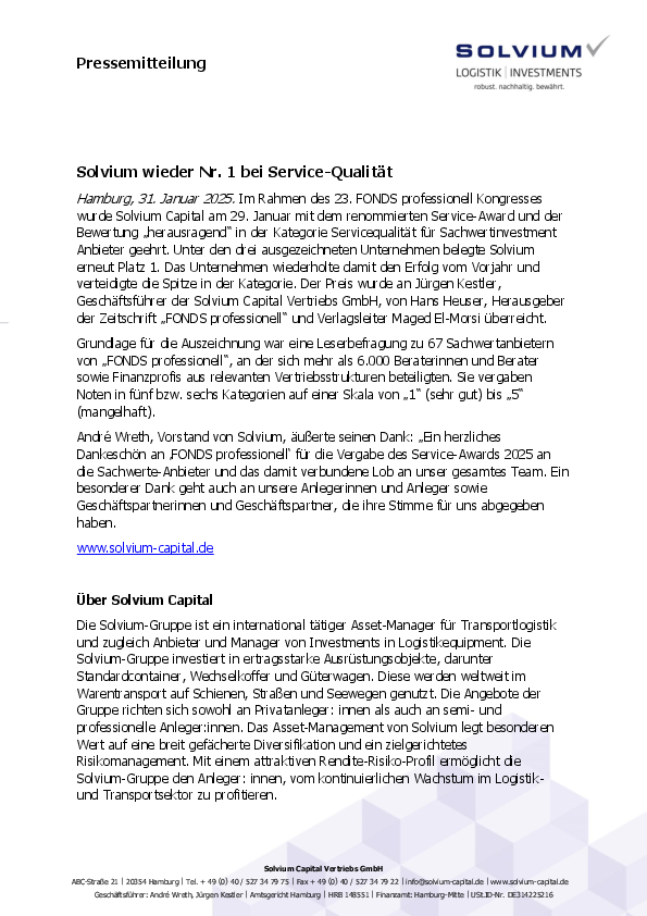 Die Solvium-Gruppe ist ein international tätiger Asset-Manager für Transportlogistik und zugleich Anbieter und Manager von Investments in Logistikequipment. Die Solvium-Gruppe investiert in ertragsstarke Ausrüstungsobjekte, darunter Standardcontainer, Wechselkoffer und Güterwagen. Diese werden weltweit im Warentransport auf Schienen, Straßen und Seewegen genutzt. Die Angebote der Gruppe richten sich sowohl an Privatanleger: innen als auch an semi- und professionelle Anleger:innen. Das Asset-Management von Solvium legt besonderen Wert auf eine breit gefächerte Diversifikation und ein zielgerichtetes Risikomanagement. Mit einem attraktiven Rendite-Risiko-Profil ermöglicht die Solvium-Gruppe den Anleger: innen, vom kontinuierlichen Wachstum im Logistik- und Transportsektor zu profitieren.