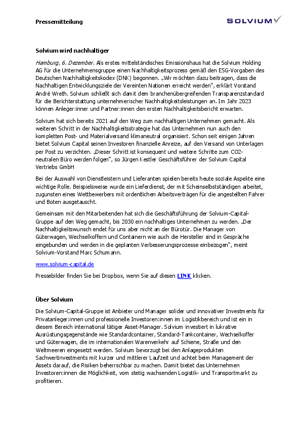 Hamburg, 6. Dezember. Als erstes mittelständisches Emissionshaus hat die Solvium Holding AG für die Unternehmensgruppe einen Nachhaltigkeitsprozess gemäß den ESG-Vorgaben des Deutschen Nachhaltigkeitskodex (DNK) begonnen. „Wir möchten dazu beitragen, dass die Nachhaltigen Entwicklungsziele der Vereinten Nationen erreicht werden“, erklärt Vorstand André Wreth. Solvium schließt sich damit dem branchenübergreifenden Transparenzstandard für die Berichterstattung unternehmerischer Nachhaltigkeitsleistungen an. Im Jahr 2023 können Anleger:innen und Partner:innen den ersten Nachhaltigkeitsbericht erwarten.