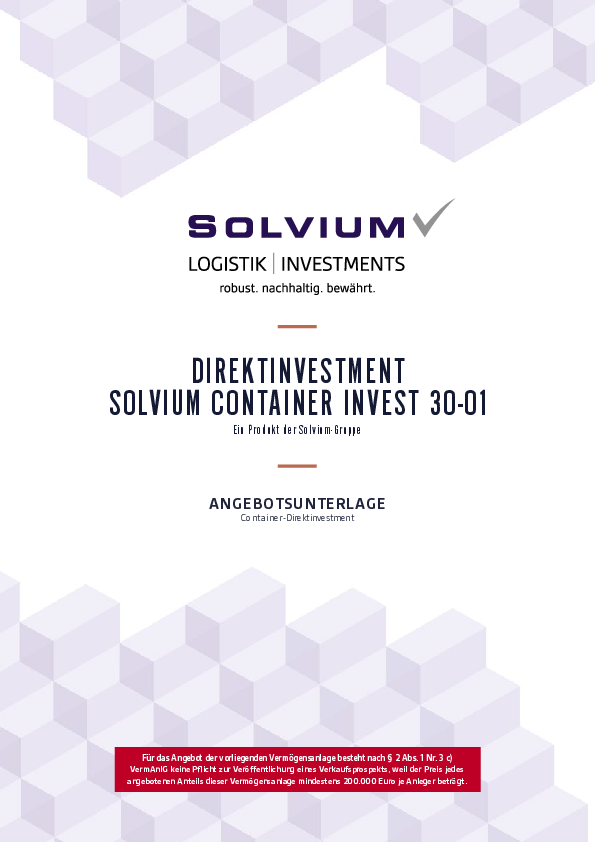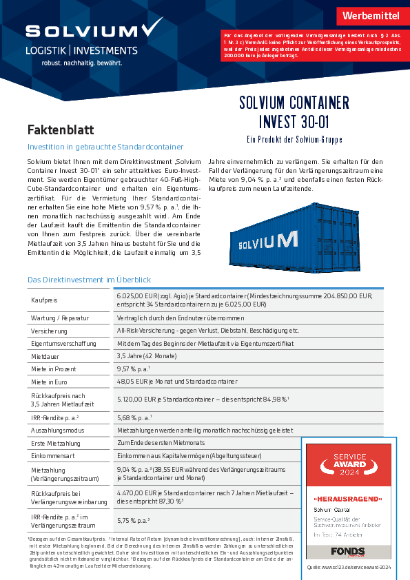 Anleger erwerben mit dem Direktinvestment Solvium Container Invest 30-01 ein sehr attraktives Euro-Investment. Sie werden Eigentümer gebrauchter 40-Fuß-High-Cube-Standardcontainer und erhalten ein Eigentumszertifikat. Für die Vermietung Ihrer Standardcontainer erhalten Anleger eine hohe Miete von 9,57 % p. a. (bezogen auf den Gesamtkaufpreis), die ihnen monatlich nachschüssig ausgezahlt wird. Am Ende der Laufzeit kauft die Emittentin die Standardcontainer von den Anlegern zum Festpreis zurück. Über die vereinbarte Mietlaufzeit von 3,5 Jahren hinaus besteht für die Anleger und die Emittentin die Möglichkeit, die Laufzeit einmalig um 3,5 Jahre einvernehmlich zu verlängern. Anleger erhalten für den Fall der Verlängerung für den Verlängerungszeitraum eine Miete von 9,04 % p. a. (bezogen auf den Rückkaufpreis der Standardcontainer am Ende der anfänglichen 42-monatigen Laufzeit der Mietvereinbarung) und ebenfalls einen festen Rückkaufpreis zum neuen Laufzeitende.