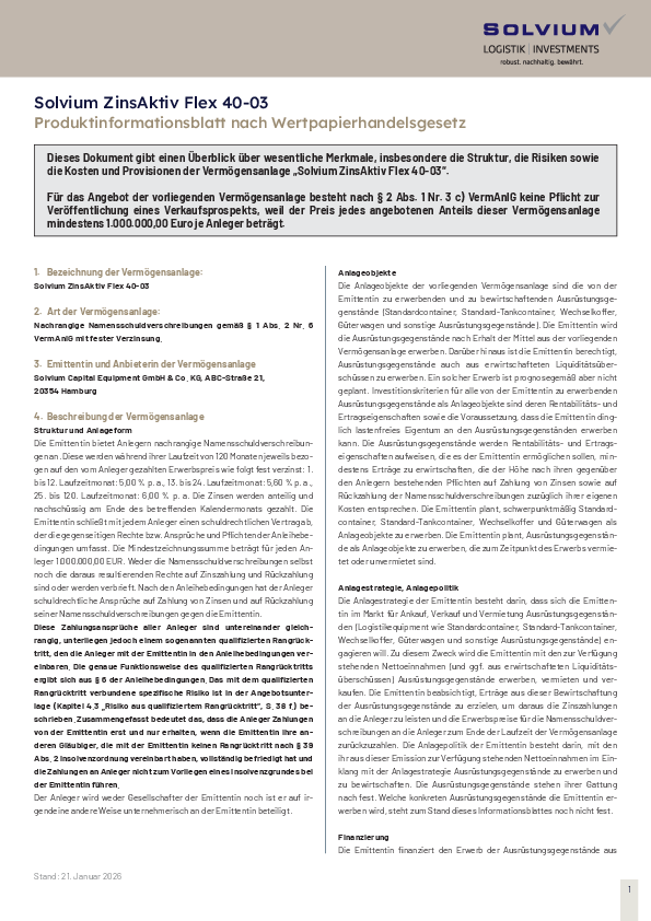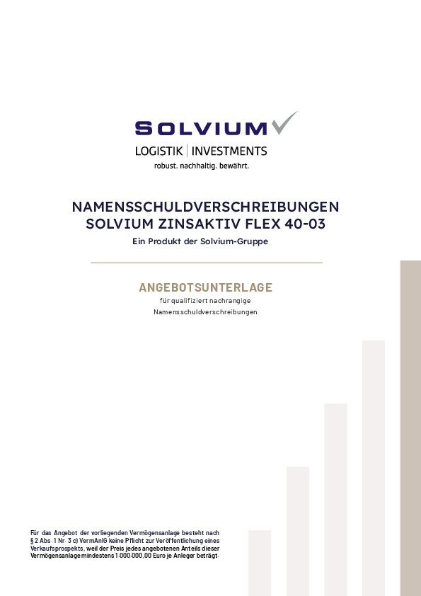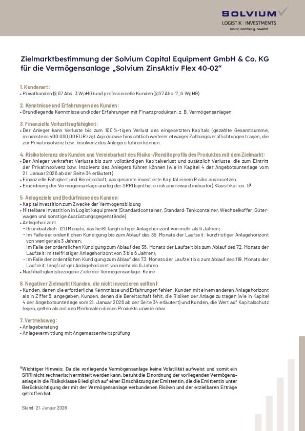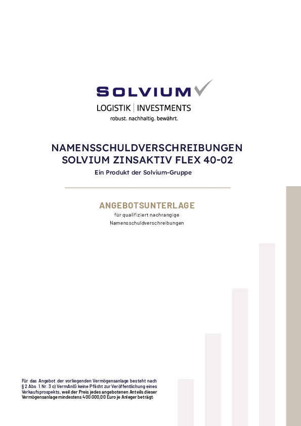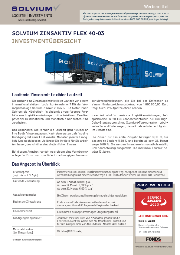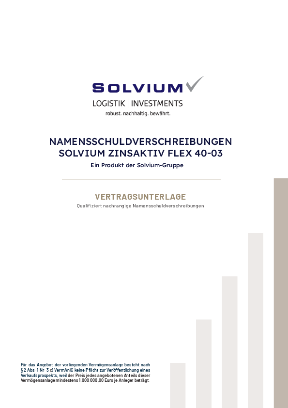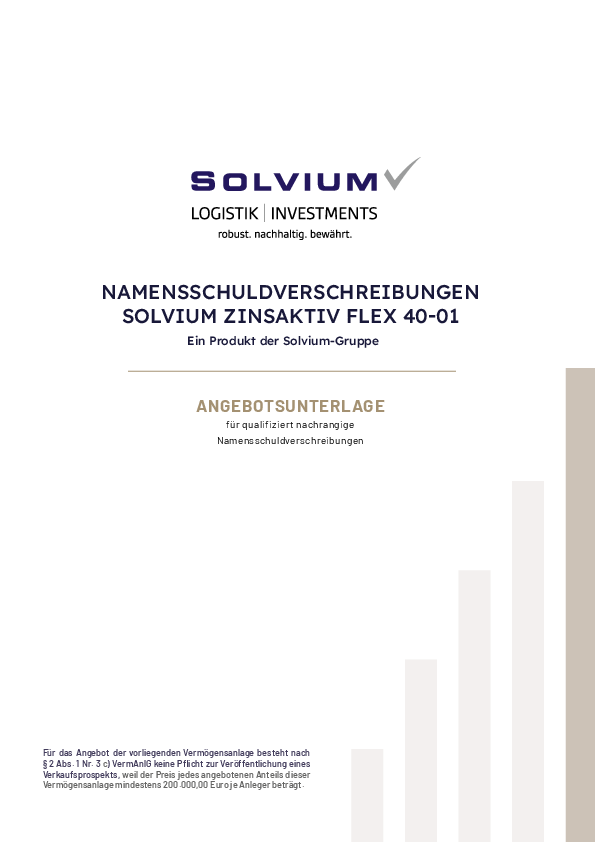 Mit den Vermögensanlagen der Angebotsreihe Solvium ZinsAktiv Flex bietet Ihnen Solvium die Möglichkeit, in ein breit diversifiziertes Portfolio von Logistikausrüstungen mit attraktivem Renditepotenzial zu investieren und monatlich einen festen Zins zu erhalten. Das Besondere: Sie können die Laufzeit ganz flexibel an Ihre Bedürfnisse anpassen. Nach dem ersten Jahr ist eine Kündigung mit einer Frist von drei Monaten jederzeit möglich. Und noch besser: Je länger Sie Ihr Geld für Sie arbeiten lassen, desto höher sind die jährlichen Zinsen!